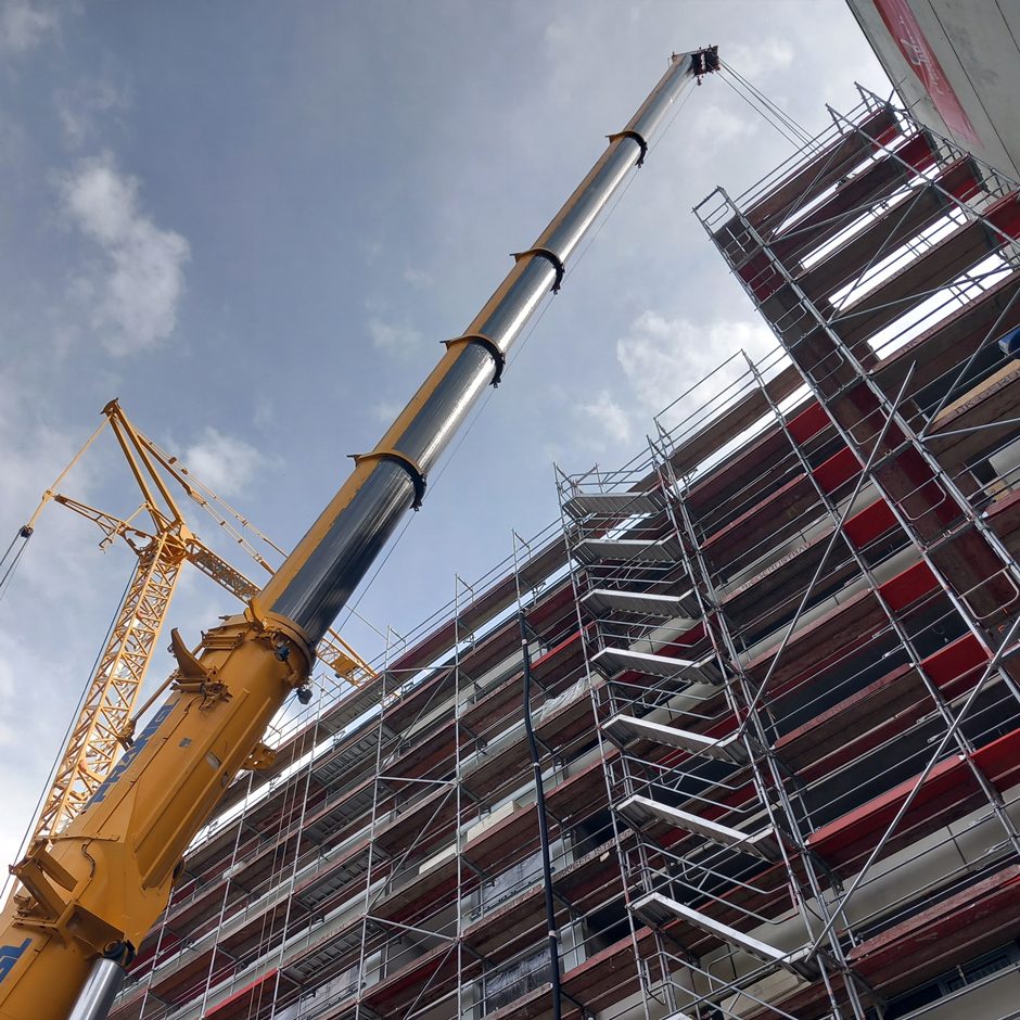 Dach, Fenster, Wärmedämmverbundsystem und Kellerdeckendämmung wurden erfolgreich saniert und senken den Energieverbrauch schon jetzt deutlich. Ein besonderer Meilenstein war kürzlich der Einsatz eines Spezialkrans für die neuen Aufzugstürme. Dieser platzierte die Betonschächte mit jeweils rund 20 Tonnen Gewicht – insgesamt sind dabei knapp 320 Tonnen Material bewegt worden.