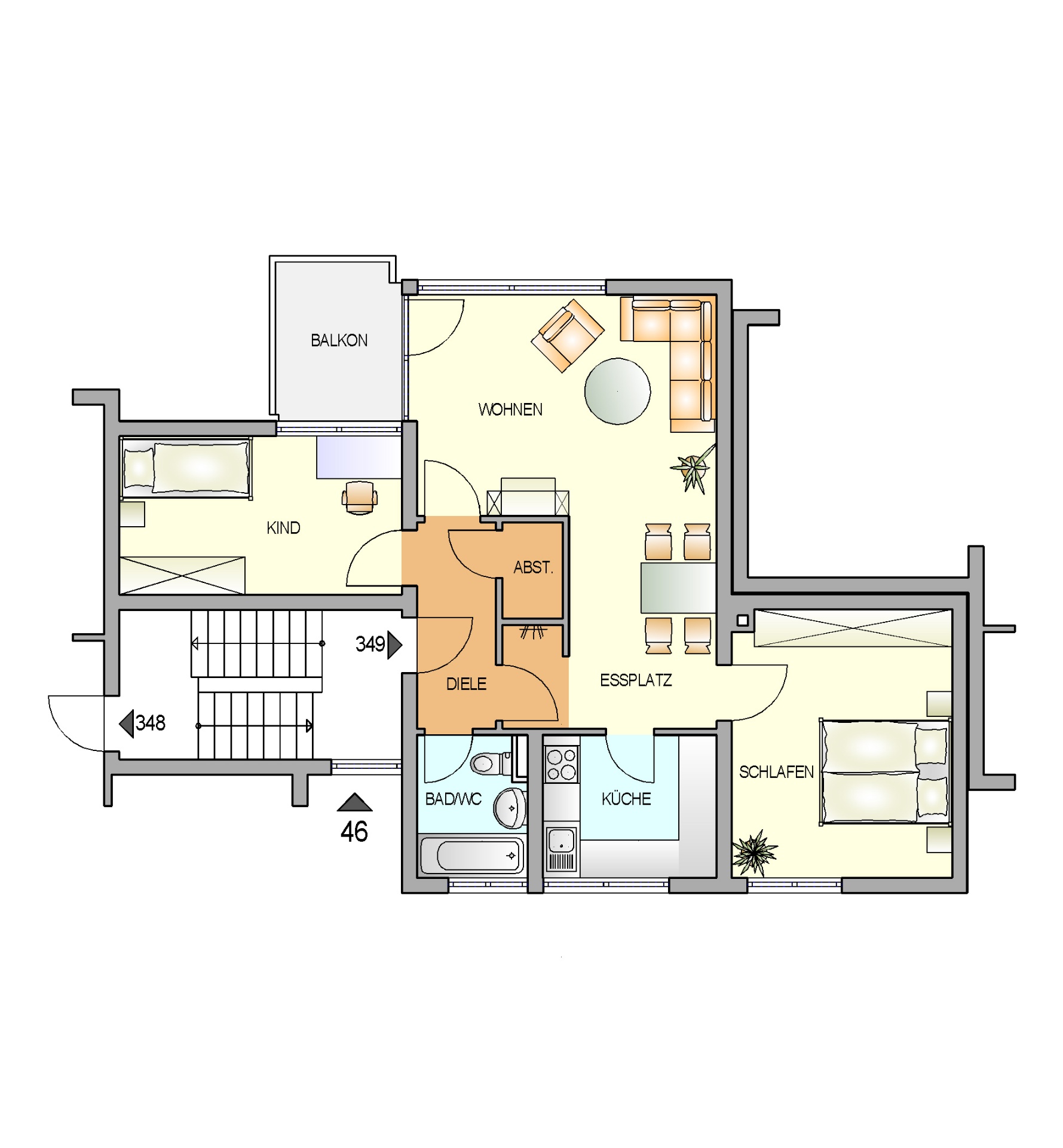 Der Grundriss eignet sich ideal für ein Pärchen oder eine kleine Familie.