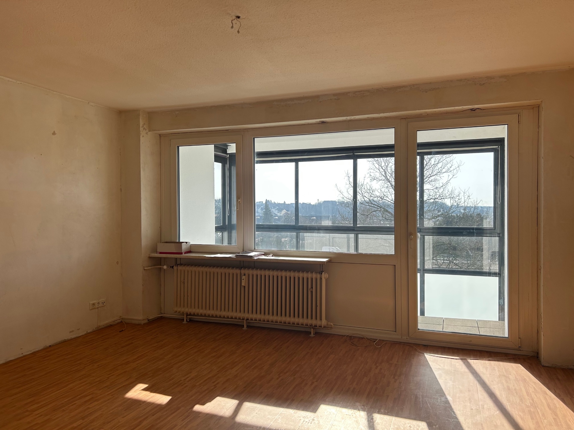 Mit dem Betreten der Wohnung gelangen Sie in den Flur, von dem aus die Küche sowie das großzügige Wohnzimmer mit Balkon erreichbar sind.