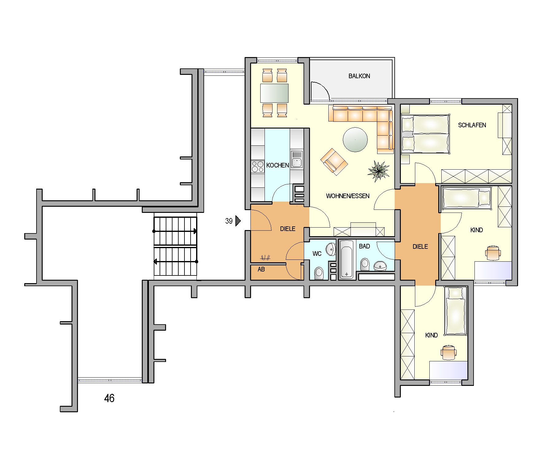 Diese familienfreundliche 4-Zimmer-Wohnung befindet sich im 6. Obergeschoss eines Mehrfamilienhaus in ruhiger Lage am Hasten.
