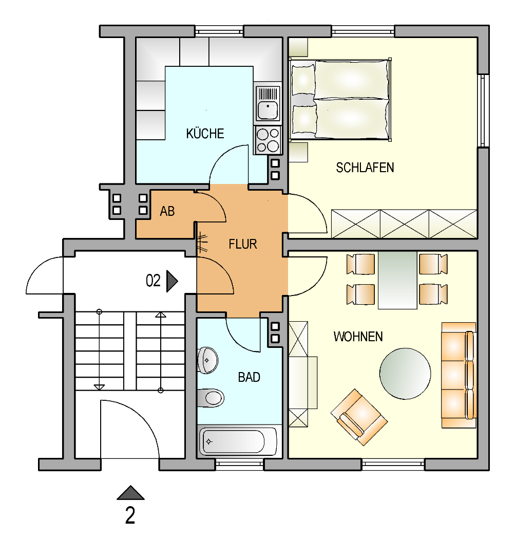 Diese gut geschnittene 2-Zimmer-Wohnung liegt im erhöhten Erdgeschoss eines überschaubaren Mehrfamilienhauses. Beim Betreten gelangen Sie in einen Flur, von dem aus alle Räume bequem erreichbar sind.