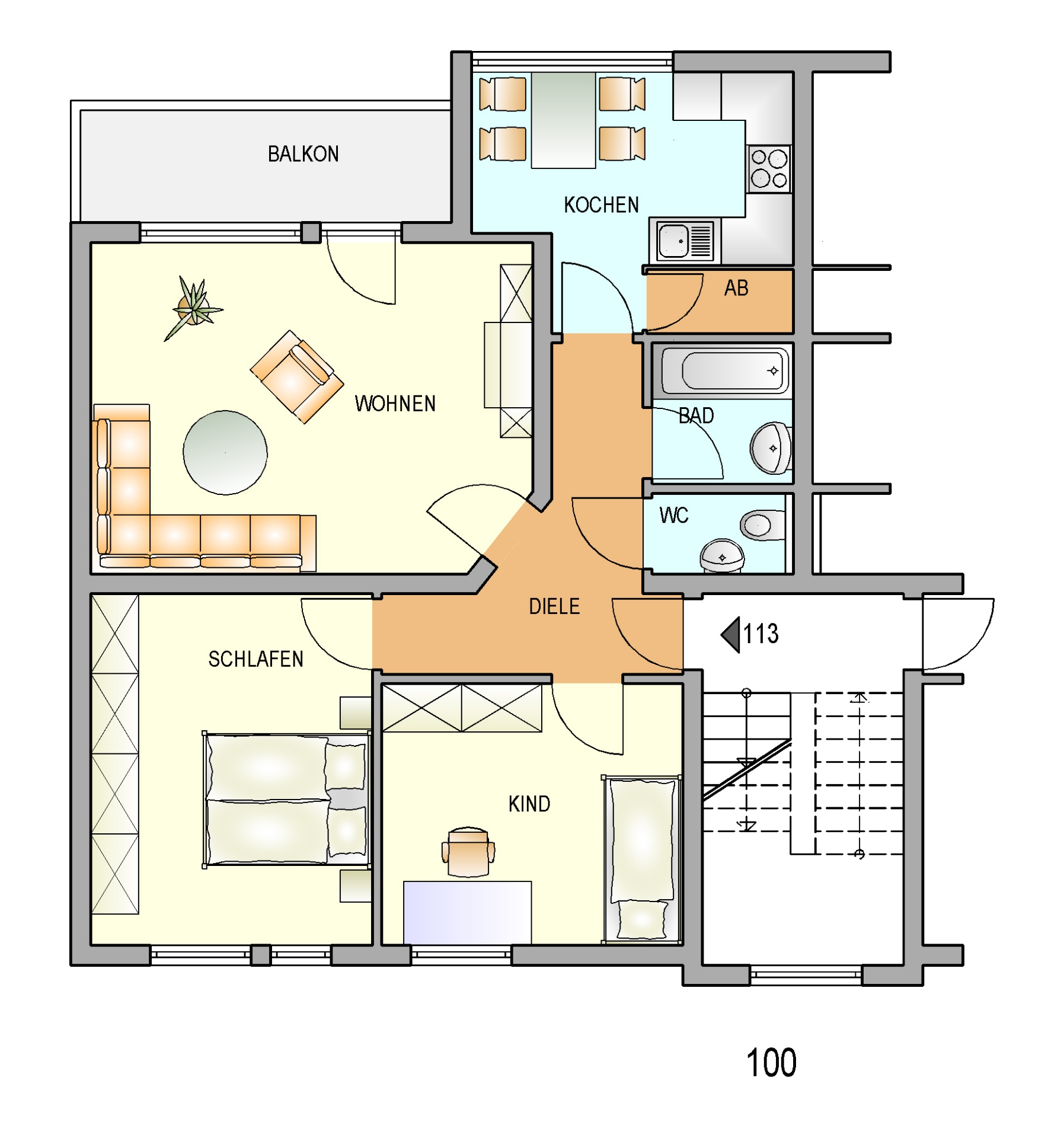 Mit dem Eintritt gelangt man in eine Diele, von welcher aus alle Räumlichkeiten zu erreichen sind.