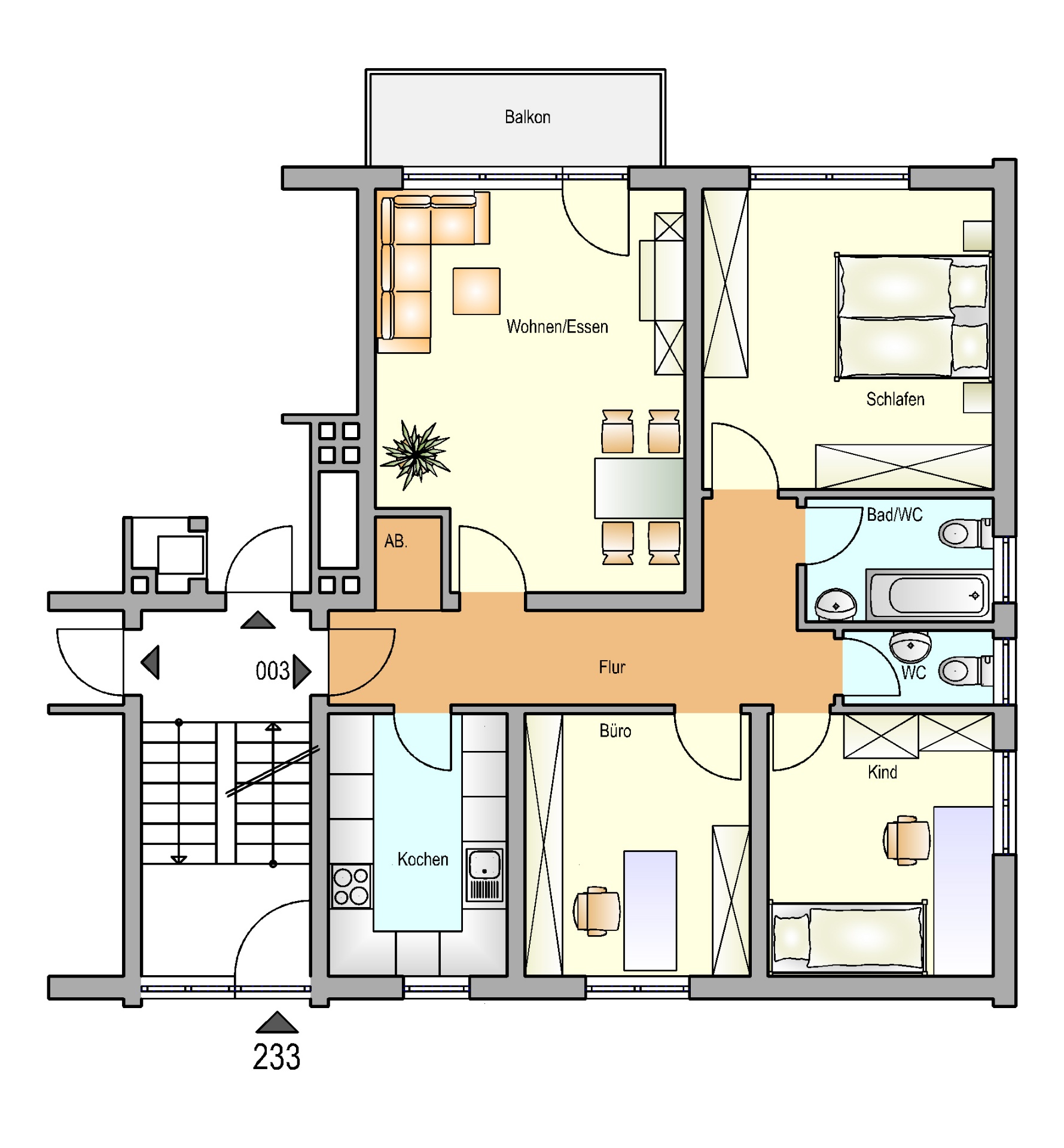 Mit dem Eintritt in die Wohnung gelangen Sie in den Flur, vom welchem alle Räume zu erreichen sind. Auf der linken Seite befindet sich das geräumige Wohnzimmer mit Zugang zum Balkon und das Schlafzimmer. Gerade aus liegt das helle Badezimmer mit Tageslichteinfall und einer Badewanne. Direkt anliegend befindet sich praktischerweise ein Gäste WC, das ebenfalls mit einem Fenster ausgestattet ist. Die Küche und zwei weitere Zimmer, die als Kinderzimmer geeignet sind, befinden sich auf der rechten Seite der Wohnung.