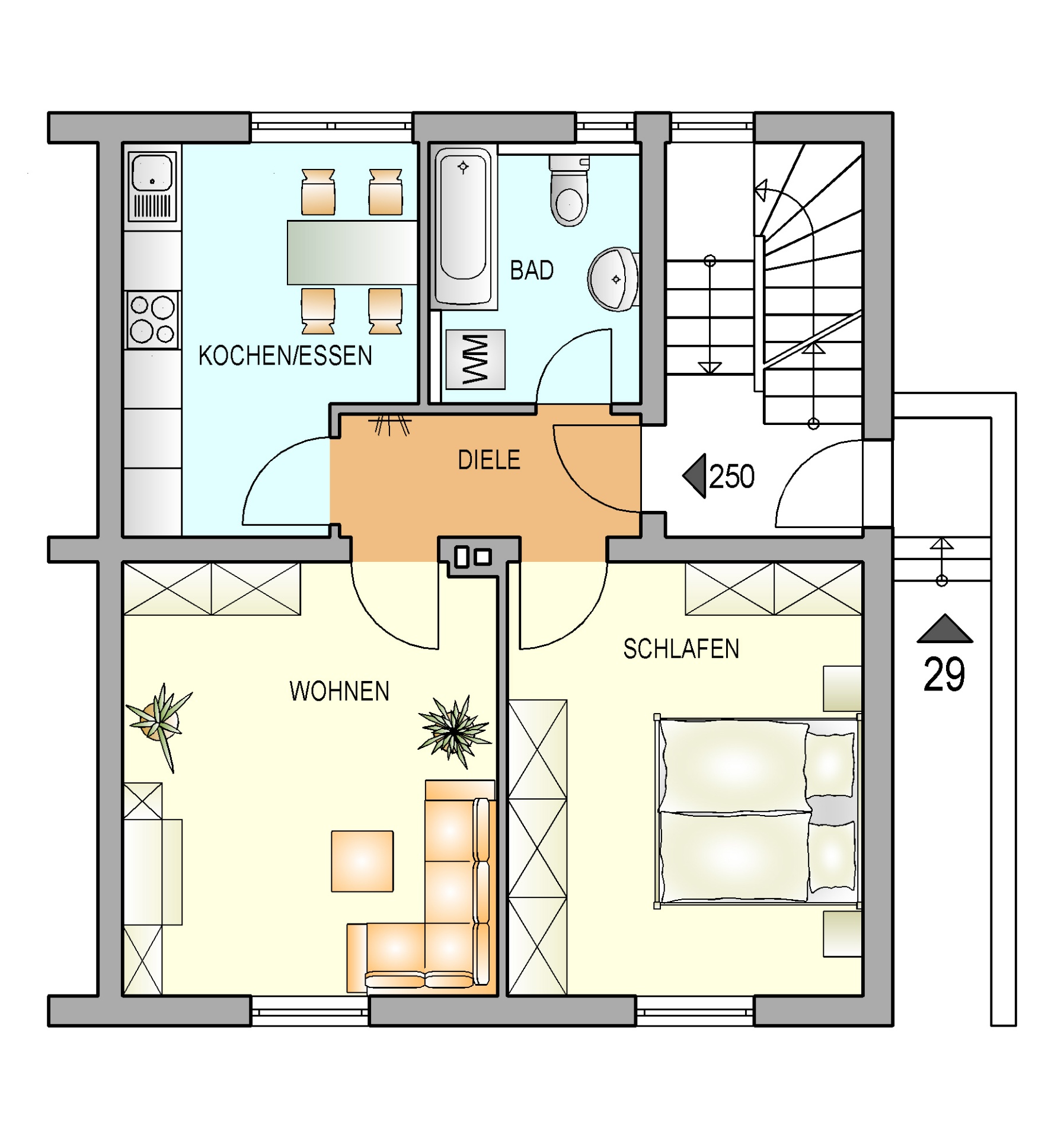 Vom Hausflur gelangen Sie in die Eingangsdiele von der Sie alle Räume erreichen. Rechts das Badezimmer mit Wanne und Fenster. Links das Schlafzimmer, Geradeaus die Küche mit einem kleinem Essplatz. Das Wohnzimmer befindet sich hinten links. Ein Waschmaschinenanschluss befindet sich in der Waschküche. Eine kleine Gartenparzelle hinter dem haus lädt für entspannte Stunden im Grünen ein.