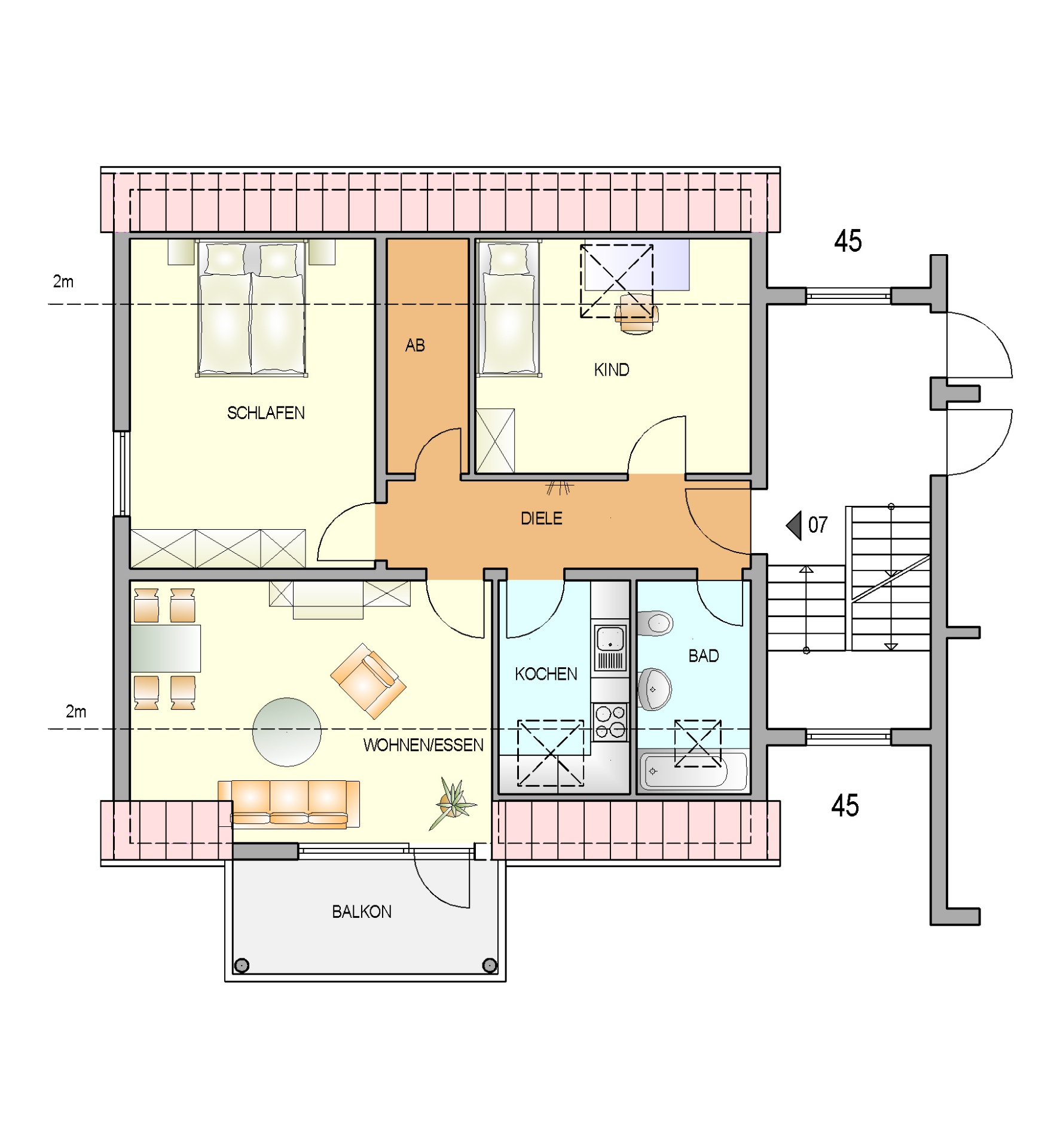 Mit dem Eintritt in die Wohnung gelangen Sie in den Flur, von welchem alle Räume erreichbar sind. Links befindet sich das Tageslichtbad mit Badewanne und die Küche. Rechts liegt das Kinderzimmer und ein großzügiger Abstellraum für zusätzlichen Stauraum. Gerade aus gelangen Sie in das Schlafzimmer, welches einen gemütlichen Rückzugsort bietet. Nebendran liegt der gemütliche Wohnbereich. Von hier ist der und einladende Balkon zu erreichen. Er bietet einen tollen Weitblick.