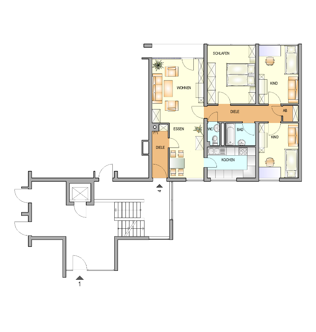 Diese super aufgeteilte Wohnung befindet sich im Erdgeschoss eines Mehrfamilienhauses, allerdings müssen einige Treppen zur Wohnung zu Fuß gegangen werden.