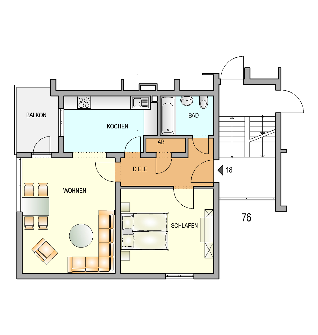 Beim Betreten der Wohnung gelangen Sie in den Flur, von welchem das Badezimmer, das Schlafzimmer, die Küche und das Wohnzimmer begehbar sind. Das Highlight ist das moderne Badezimmer mit einem durchdachten Design und einer Dusche. Der Balkon, welchen Sie durch das helle Wohnzimmer erreichen, lädt an sonnigen Tagen zum entspannen ein.