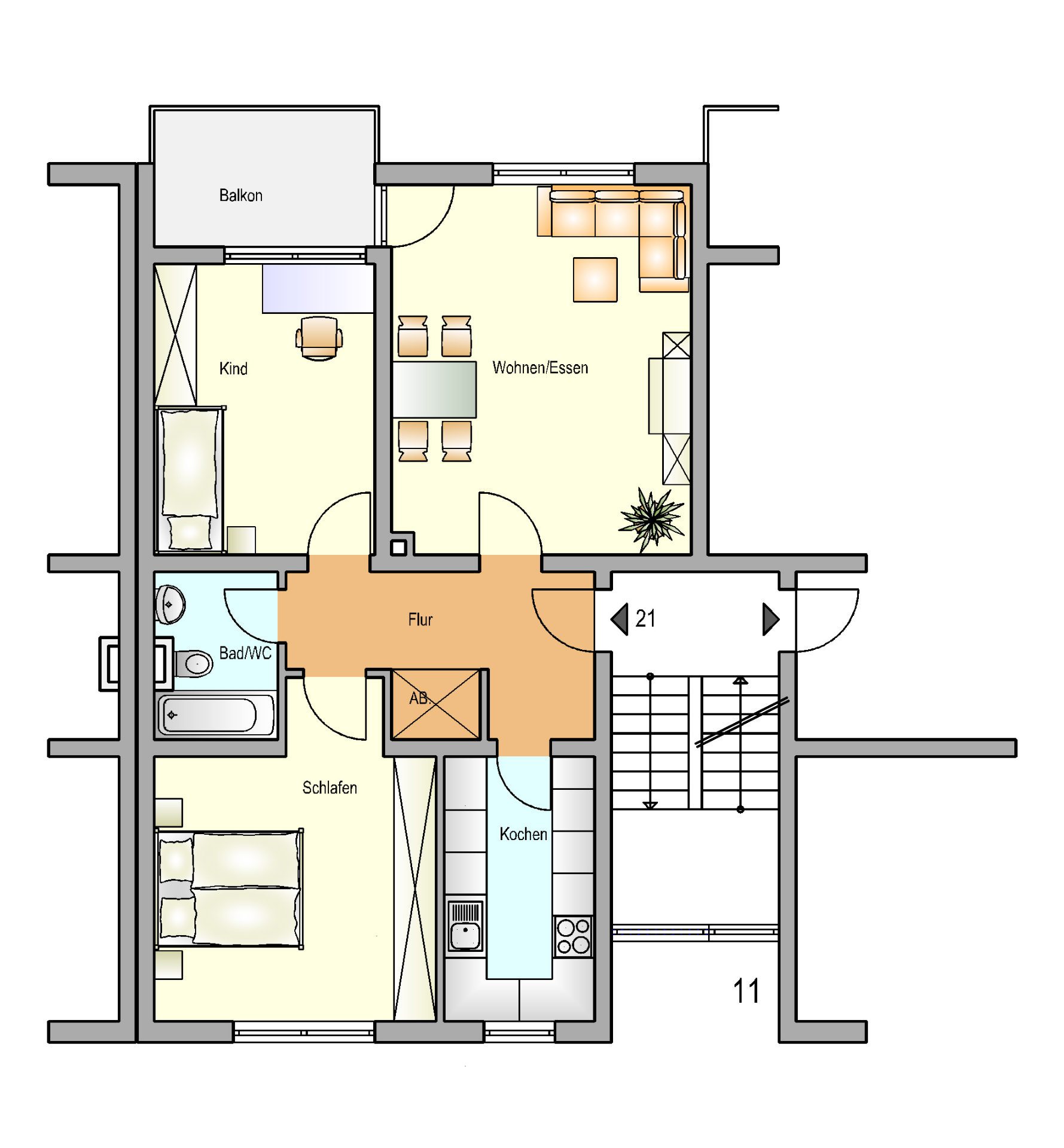 Beim betreten der Wohnung gelangen Sie in den Flur. Von dort aus sind alle Räumlichkeiten erreichbar.
