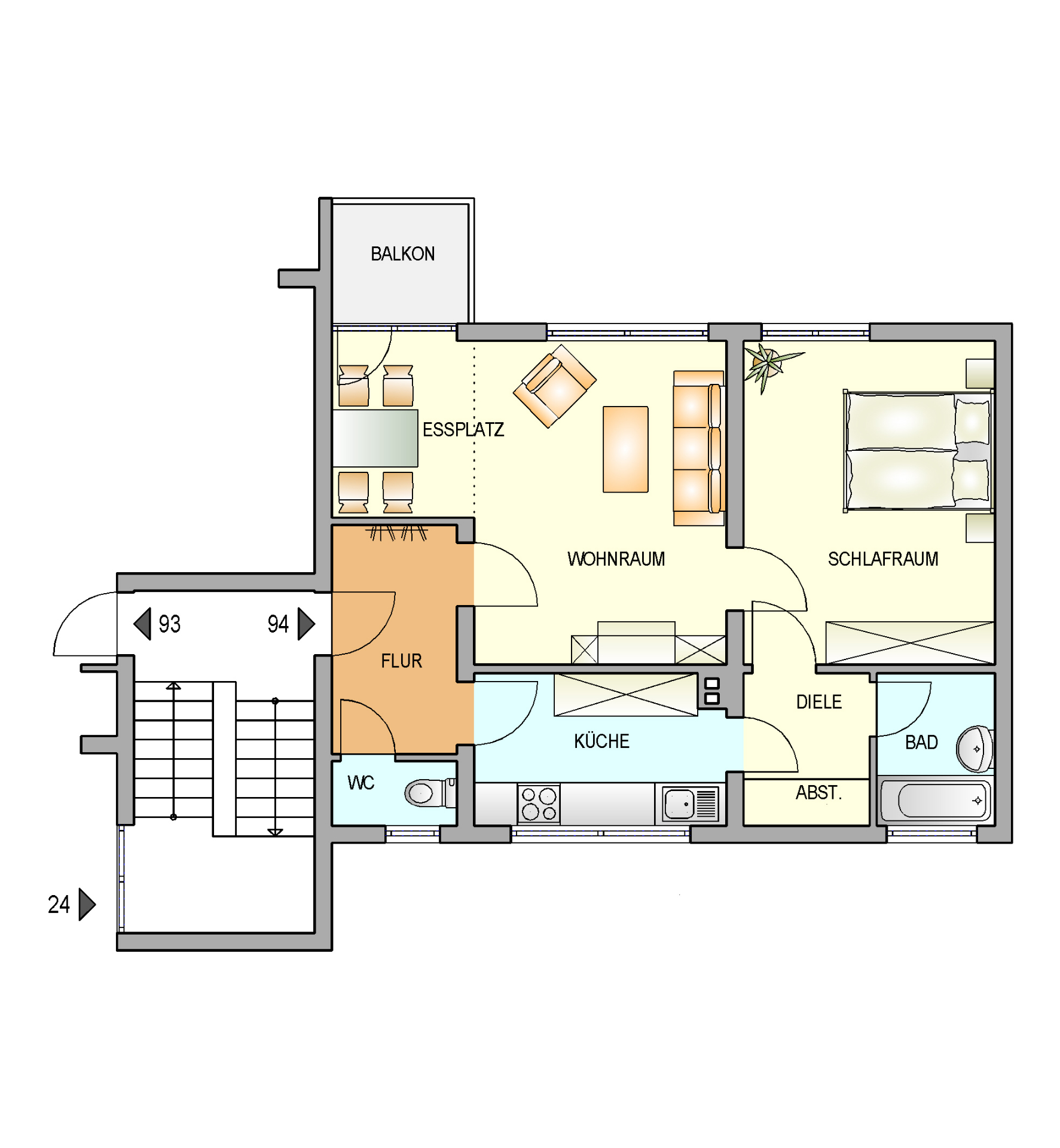 Beim betreten der Wohnung gelangen Sie in den Flur, von welchem das Gäste-WC und der offene Wohn-Essraum mit Küche zu begehen sind. Von dort aus ist der Balkon sowie das geräumige Schlafzimmer mit Zugang zum Badezimmer zu erreichen. Ein Kellerraum wird Ihnen auch zur Verfügung gestellt.