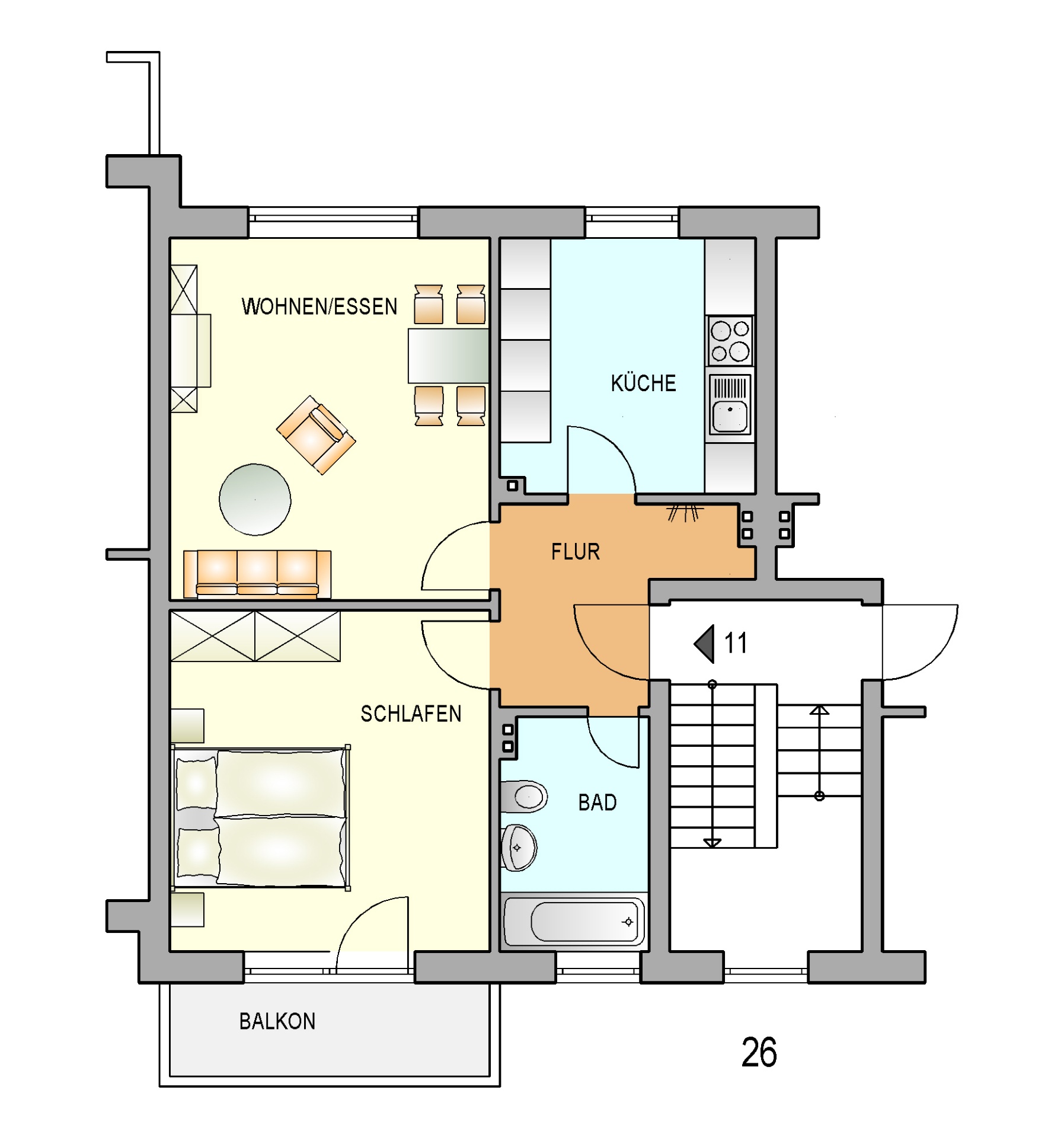 Diese gemütliche 2-Zimmer-Wohnung befindet sich im 2. Obergeschoss und bietet reichlich Platz für 1-2 Personen.
