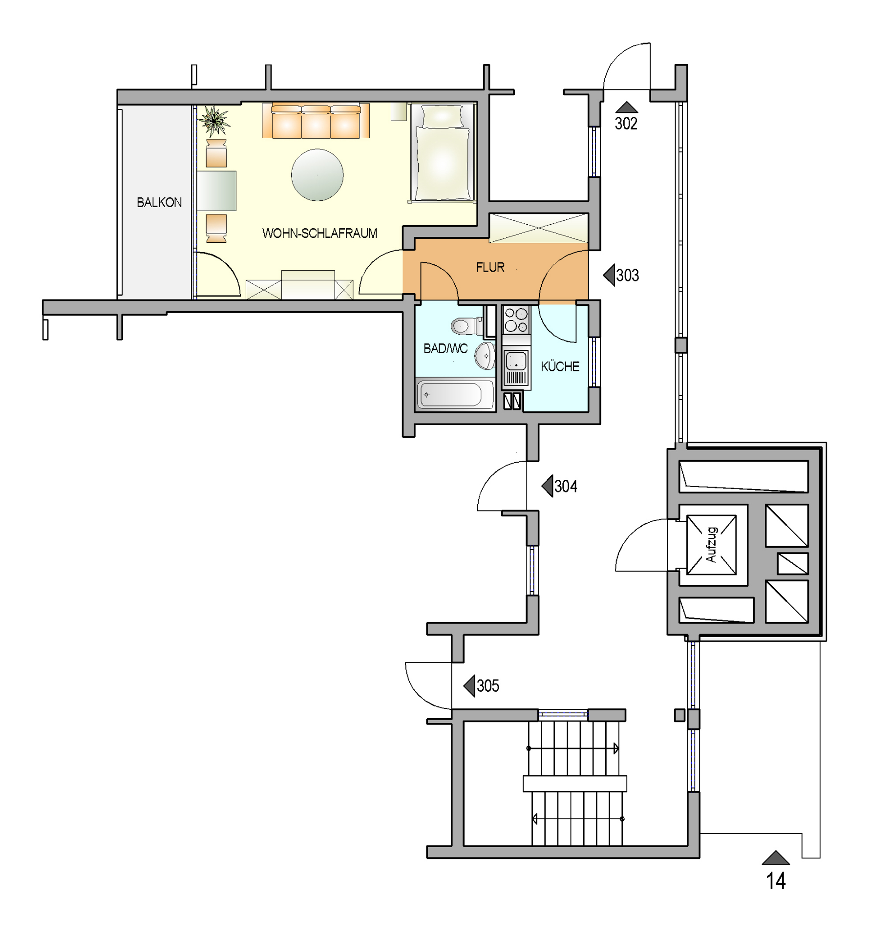 Die Wohnung befindet sich im 2. Obergeschoss des Mehrfamilienhauses und kann mit dem Aufzug erreicht werden.