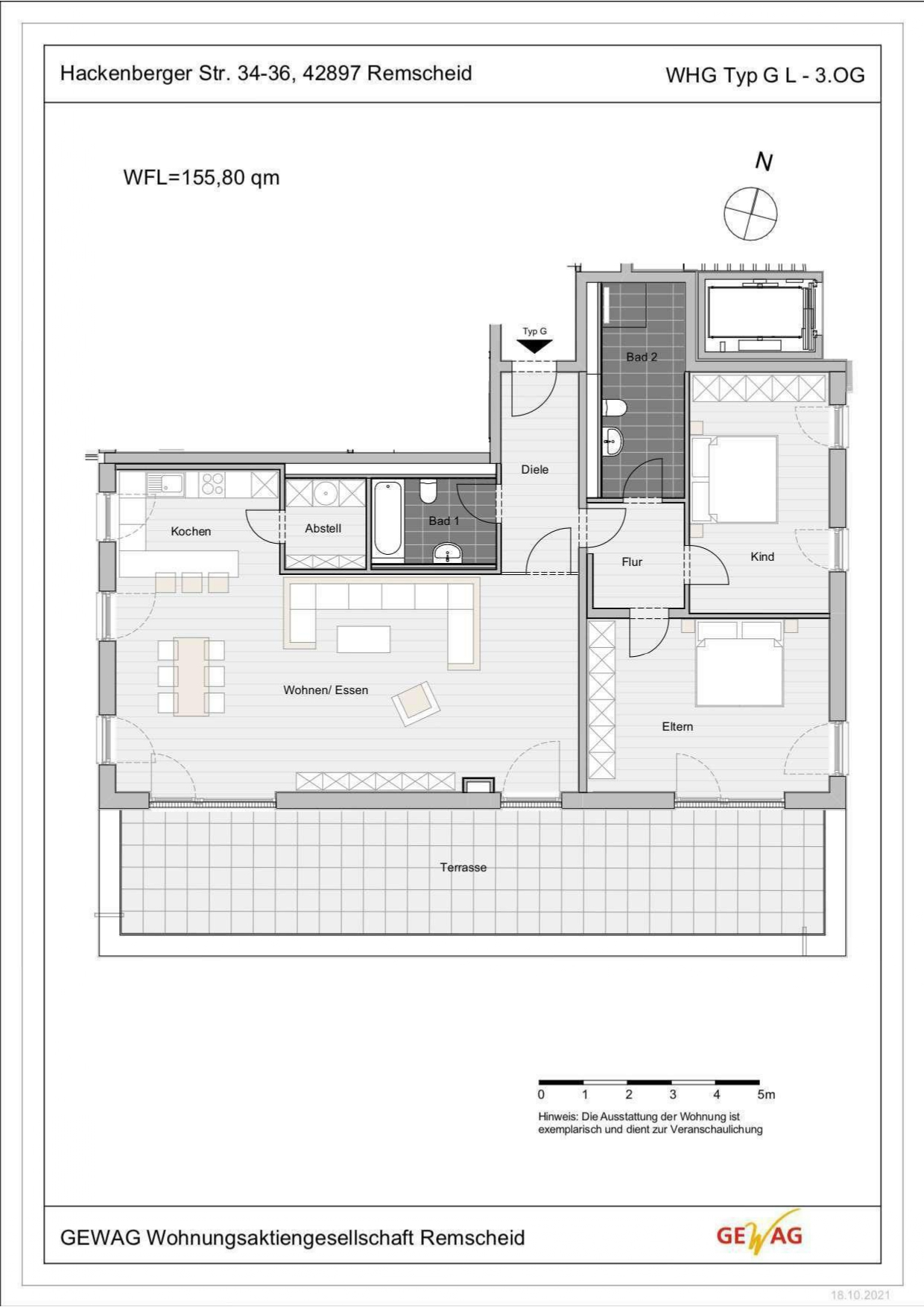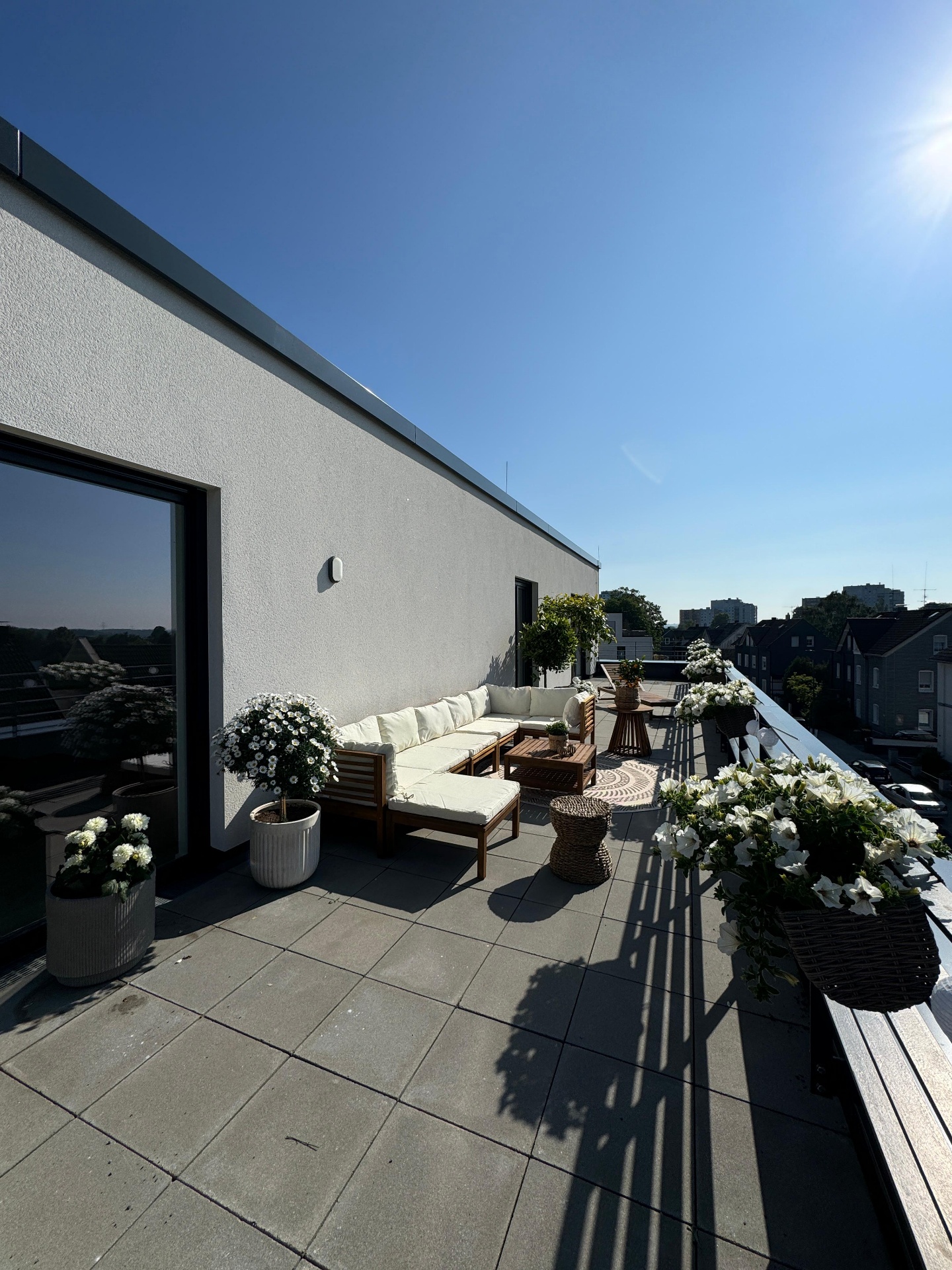 Das Highlight der Wohnung ist die großzügige Dachterrasse. Diese zieht sich über die gesamte Länge der Wohnung und ist von dem Wohnessraum und dem Elternschlafzimmer aus zu erreichen. Die Dachterrasse bietet genügend Platz für eine Loungeecke, wo Sie viele Stunden die Sonne und den Blick über die Dächer von Remscheid-Lennep genießen können.