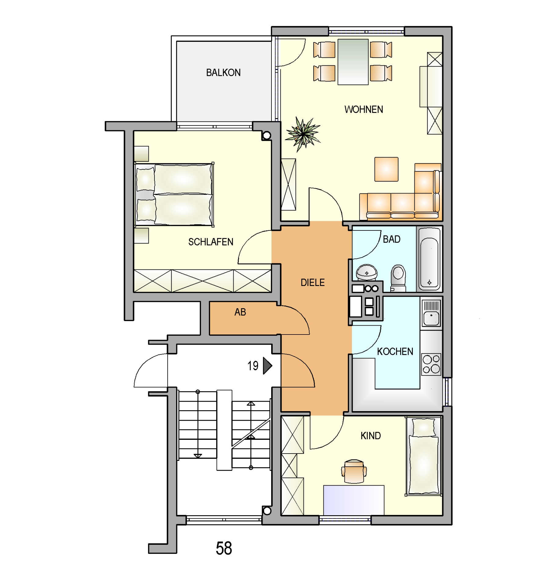 Mit dem Eintritt gelangt man in eine Diele, von welcher aus alle Räumlichkeiten zu erreichen sind.